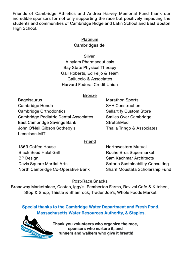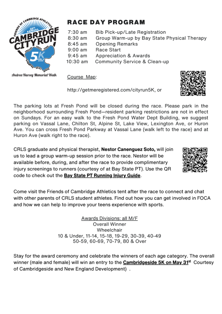 Come join us for this longstanding community tradition that brings together the CRLS community and the broader Cambridge community to share the fun of running/walking and the appreciation of Fresh Pond Reservation while raising funds for two important organizations – Friends of Cambridge Athletics and the Andrea Harvey Memorial Scholarship Fund.